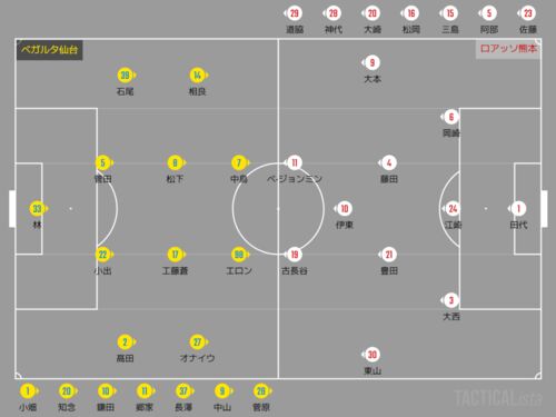 さて、今回はロアッソ熊本戦を振り返ります。 ↓前節のレビューはこちら khigu-soccer.hatenablog.com スタメン 前半 (1)2024年バージョンの熊本のボール保持 (2)熊本の仙台対策 後半 (1)「4-2-2-2」という新たな取り組み (2)なかなかこじ開けられないゴール …