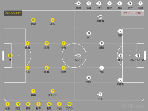 さて、今回はファジアーノ岡山戦を振り返ります。 ↓前節のレビューはこちら khigu-soccer.hatenablog.com スタメン 前半 (1)両サイドの推進力とPK奪取 (2)自陣での不安定さが目立った仙台 (3)岡山の守備に対する仙台の狙いどころ 後半 (1)与えたくなかった勝…