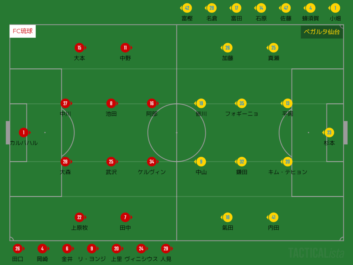 琉球は、清武が負傷離脱し古巣対戦となる阿部が2トップの一角を担う。また右サイドハーフには田中が、左サイドバックに大本でその前に中野という並びとなった。ベンチにはリ・ヨンジや金井、上里といったベテランの選手が控えている。