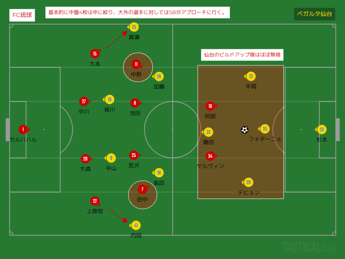 琉球の守備の狙いを改めて整理する。基本的に2トップは前プレを掛けずに仙台のビルドアップ隊は放置する。