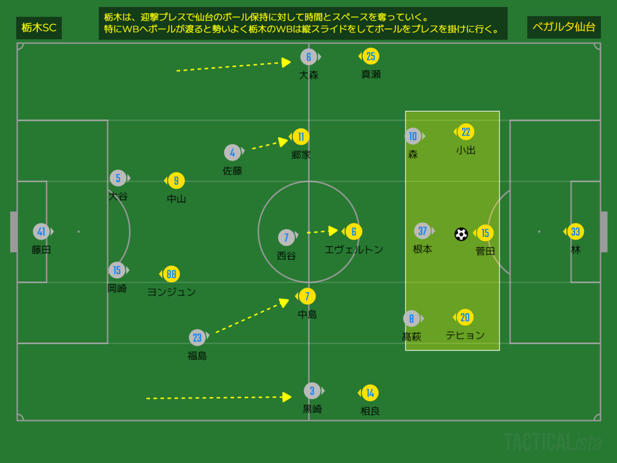 栃木は、仙台の3バックに対して1トップ2シャドーが前線からプレスを仕掛ける。それに呼応してウイングバックも仙台のウイングバックにへ高い位置からプレスを掛けてビルドアップを阻害した。また中盤では右バックの福島が一列前に出て、中島へ迎撃することがあった。