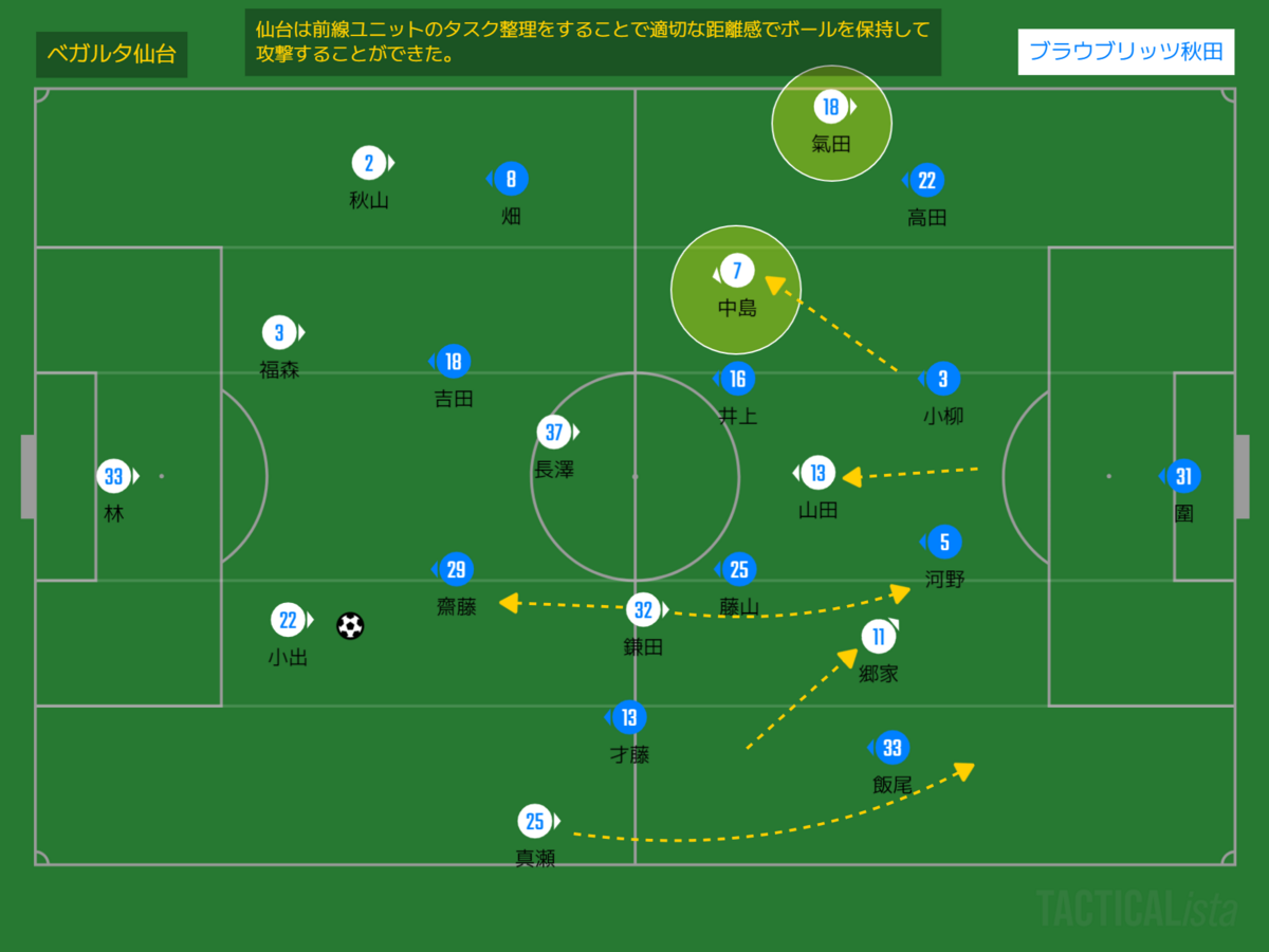 そんな役割整理のできた仙台は、左サイドから攻撃を作っていく。大外の氣田を仕掛けのキーマンとして、そこに中島や秋山、時には山田が加わって崩しに掛かる。