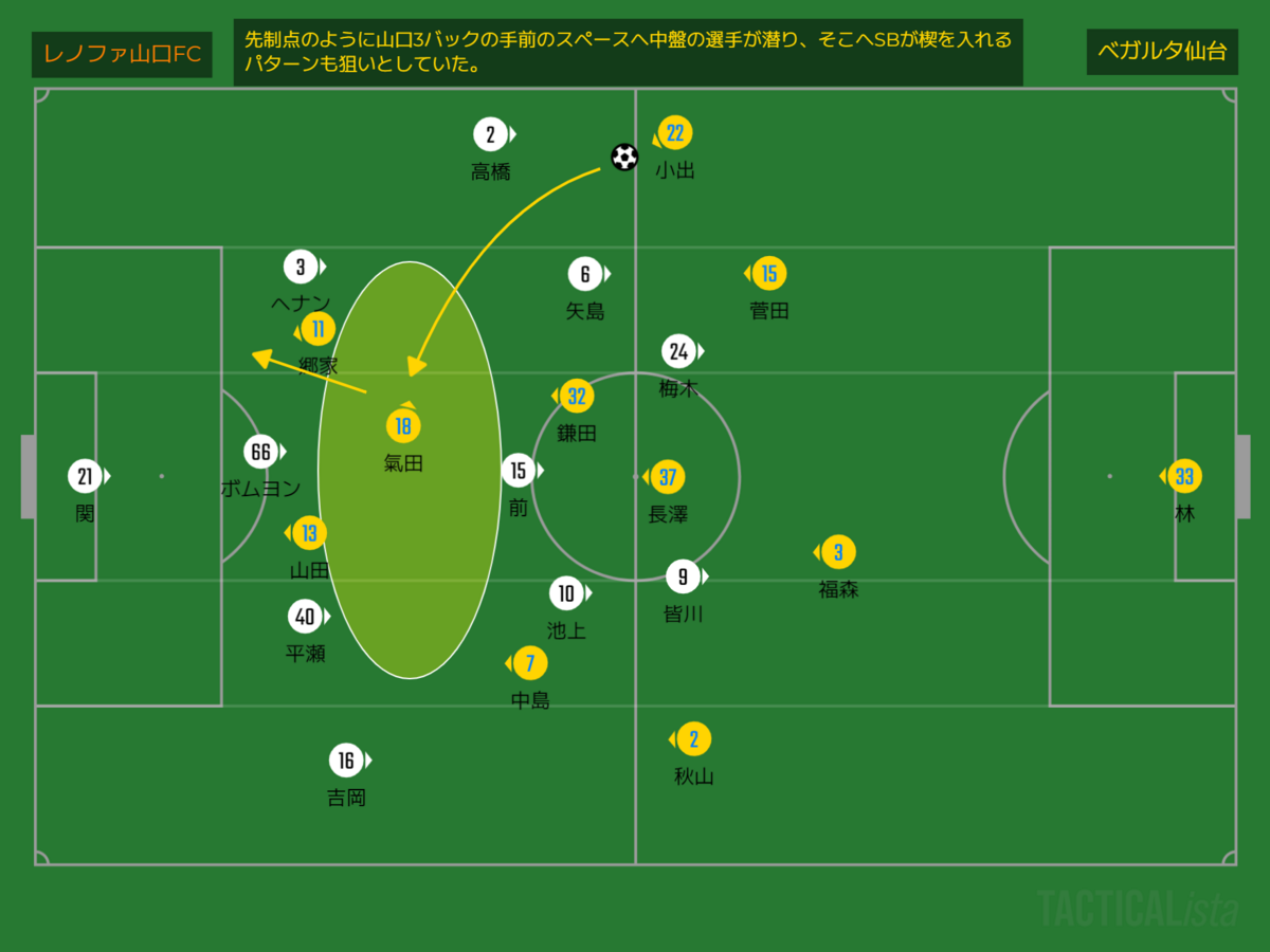 仙台としては背後の動き出しとそれに伴い空いた山口ディフェンスラインの手前のスペースを上手に活用することでゴールを奪えた。