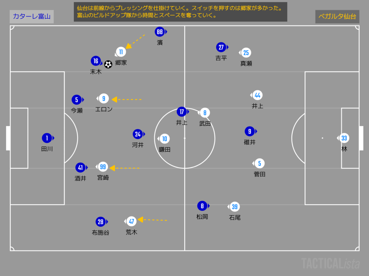 この日の仙台は、これまでの立ち上がりで見せていたミドルブロックで構える姿勢ではなく、積極的な前線からのプレッシングで富山ビルドアップ隊から時間とスペースを奪おうとしていた。