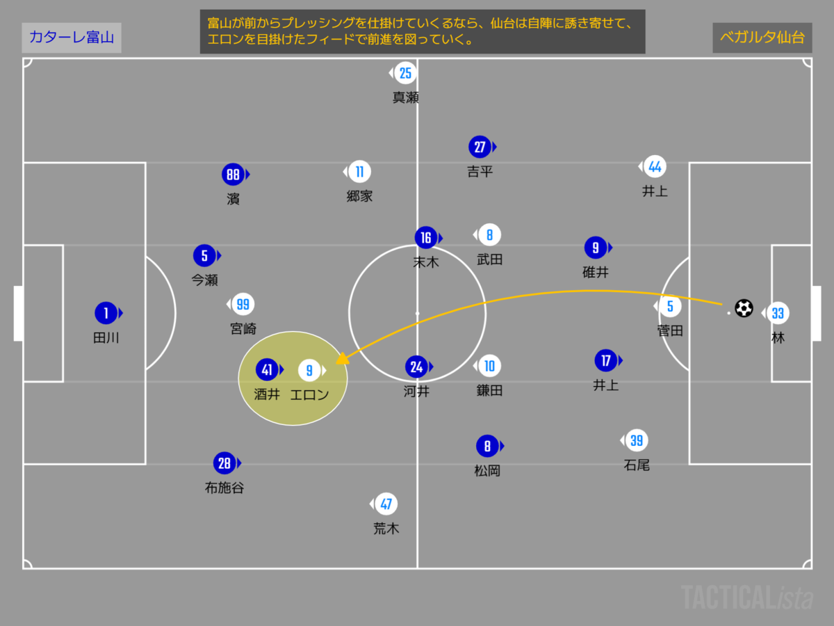 富山が仙台のプレッシングに対してロングボールを選択すれば、センターバックが競り勝って回収し、自分たちのターンにしていく。