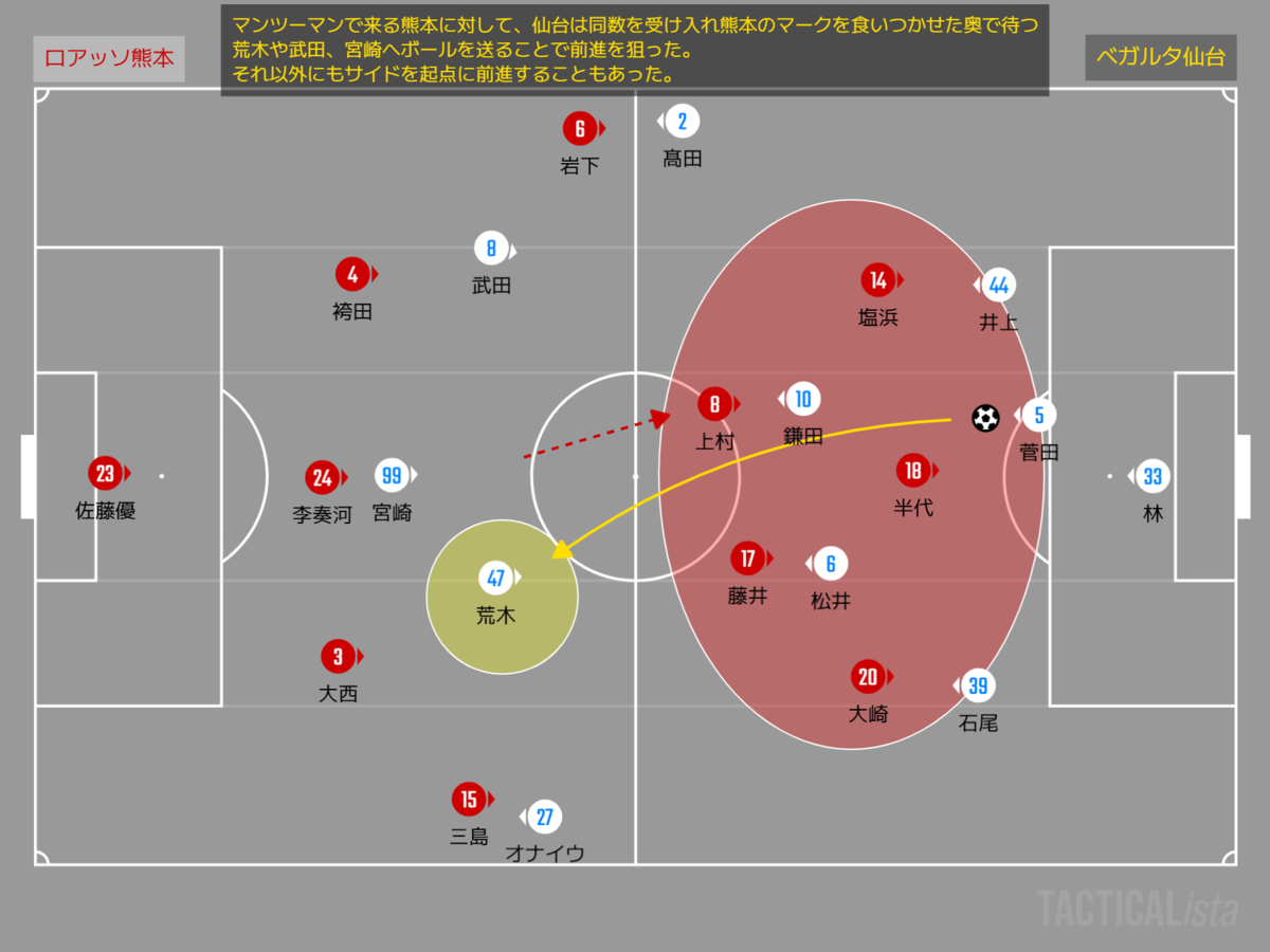 そんな熊本の守備に対して、仙台はしっかり後方でボールを動かすことで、まずは熊本のマンツーマンを食いつかせる。