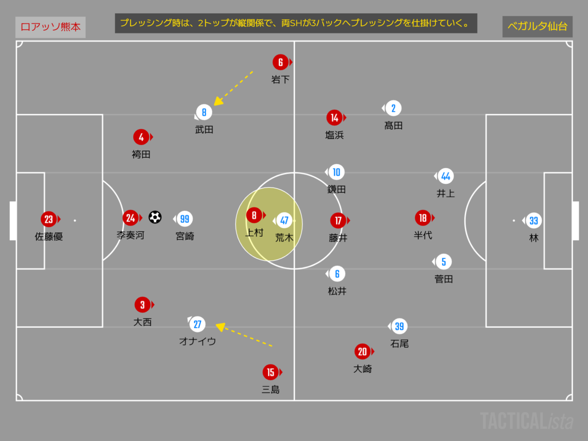 3バックと上村で形成される熊本のビルドアップ隊へは、2トップが縦関係になり両サイドハーフが3バックへプレッシングを仕掛けていく。