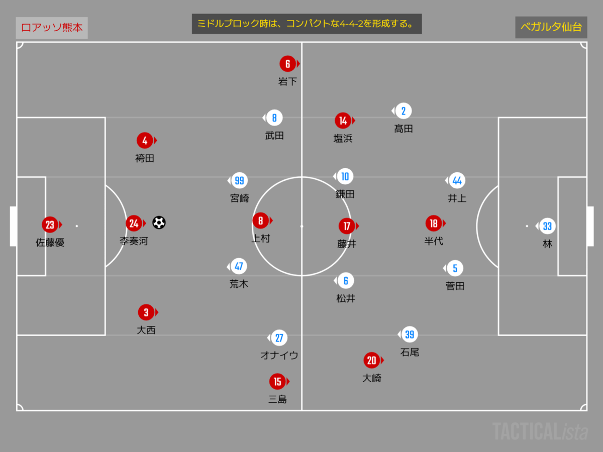 ただ熊本のボール保持に長時間プレッシングを掛けることができないので、20分すぎからはミドルブロックへと移行する。4-4-2のコンパクトな陣形を維持しながら、中央からの侵入を許さない。