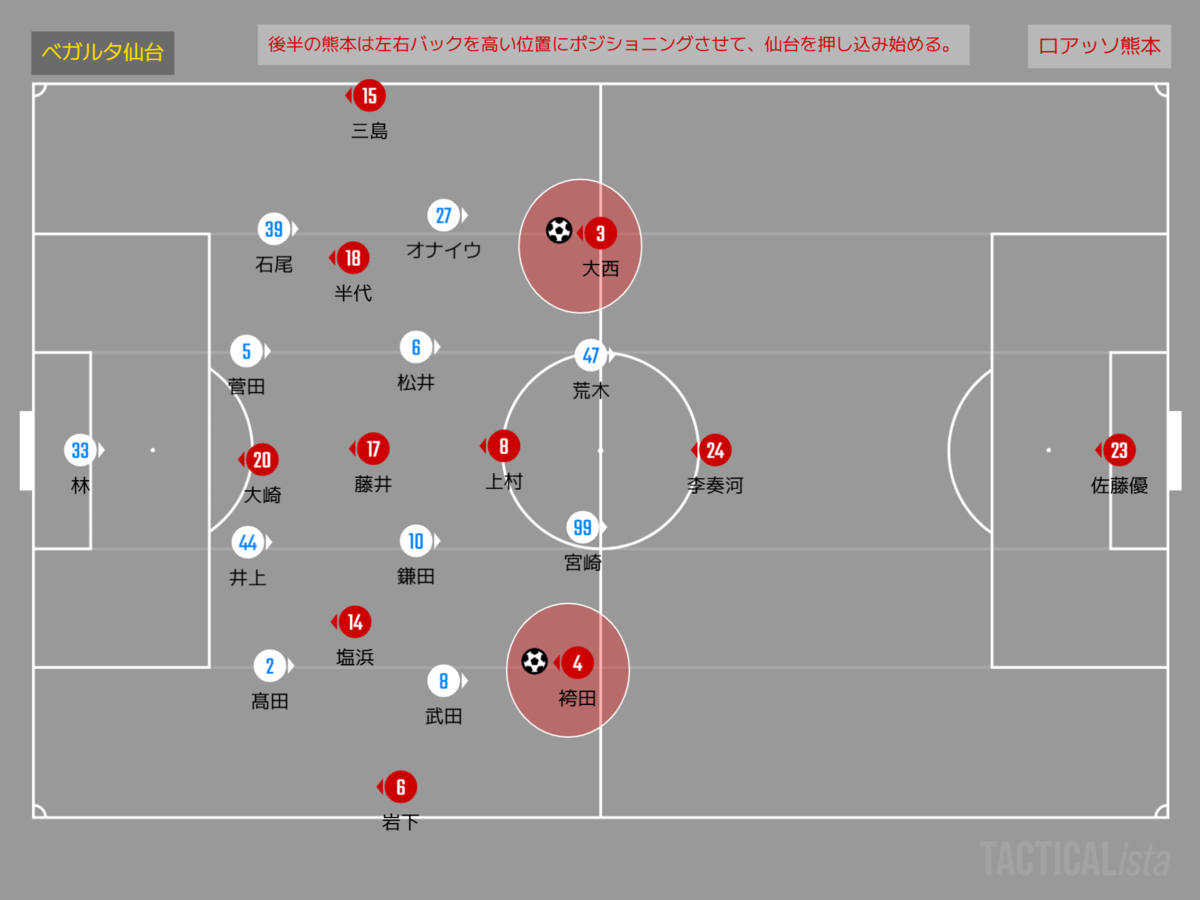熊本は袴田、大西が高い位置を取るようになり、よりサイドから攻撃していくことを目指していく。