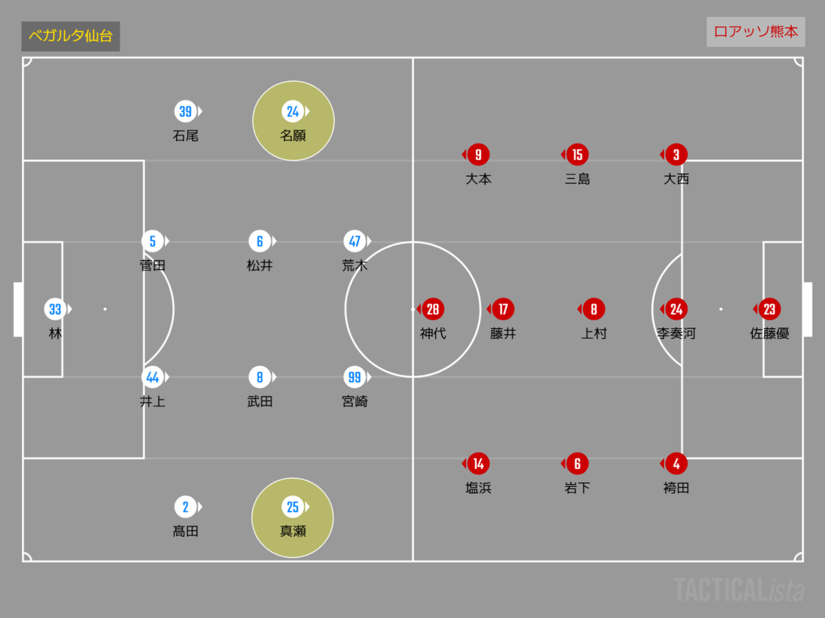 前半序盤の仙台は、熊本のボール保持に対して前からプレッシングを仕掛けていく。