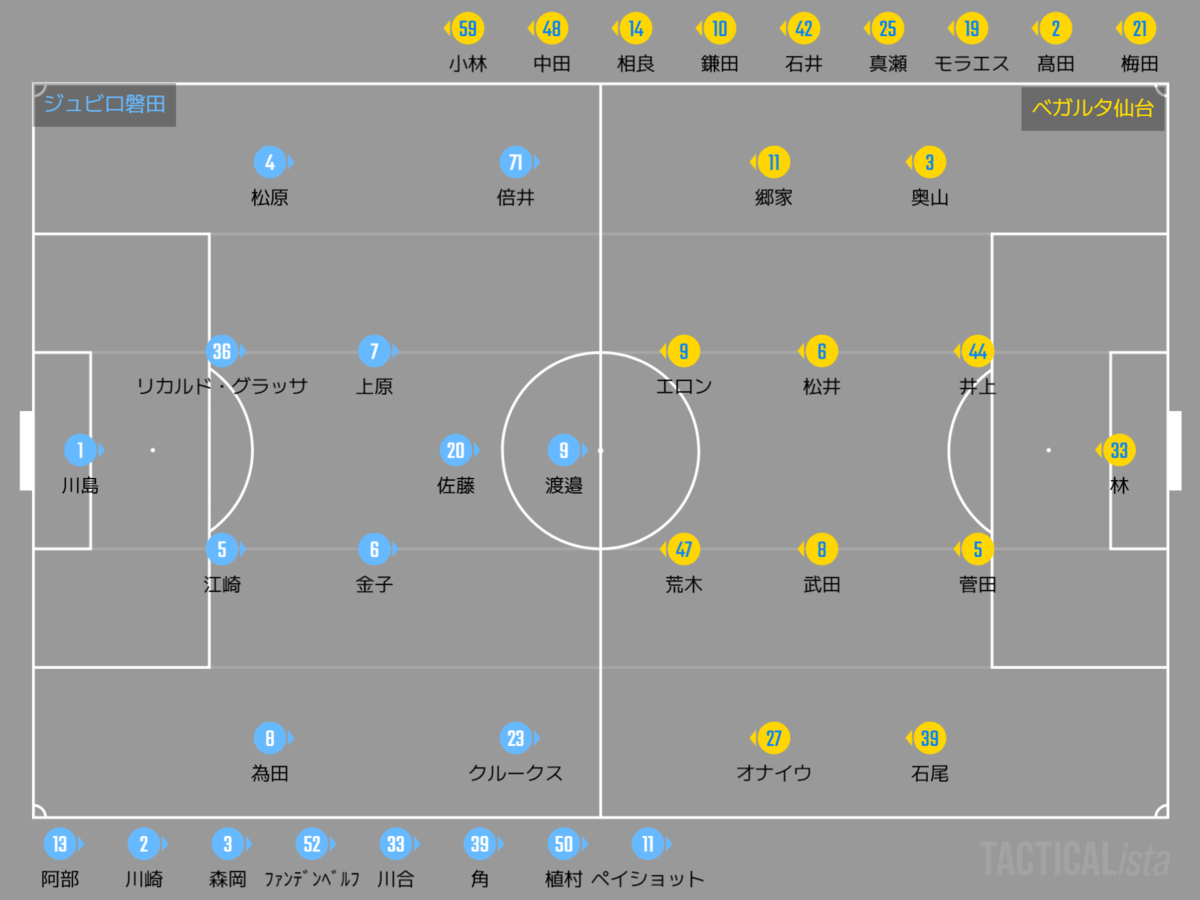 磐田は、3試合連続で同じスタメンとなった。ベンチには6月に新加入となったヤン・ファンデンベルフが初のメンバー入り。それ以外にも川崎、角、ペイショットらスタメンで起用されてもおかしくないメンバーが名を連ねている。