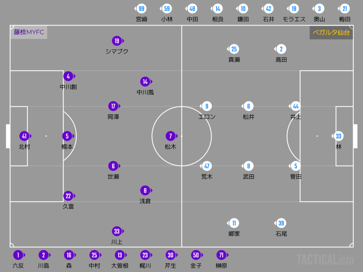 仙台は、右サイドに髙田、真瀬のコンビを起用し、郷家が左サイドハーフでスタメンとなった。ボランチには武田が松井とコンビを組む。ベンチには石井とケガから帰ってきた宮崎がメンバー入りを果たした。