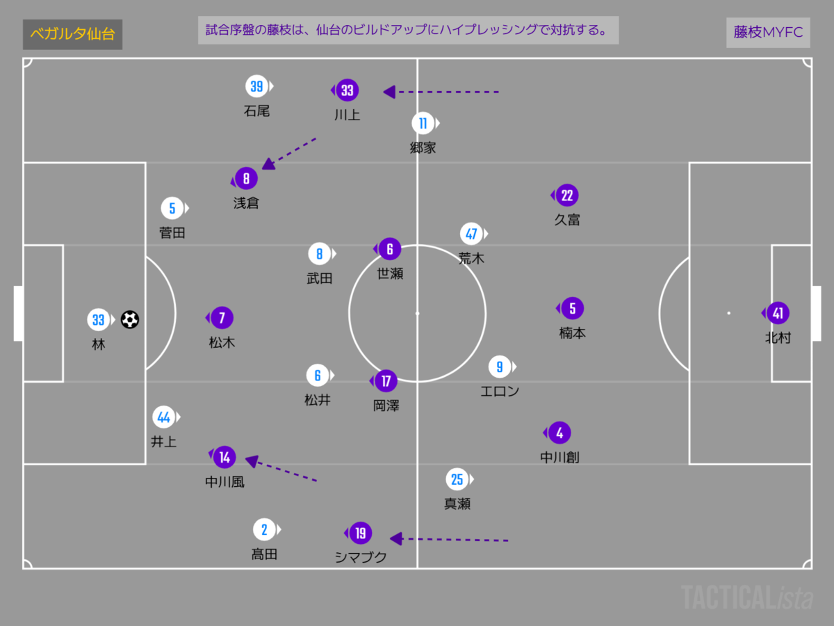 藤枝は、仙台のボール保持局面になると最前線の松木を筆頭に積極的なプレッシングでビルドアップ隊へ圧力を掛けていく。