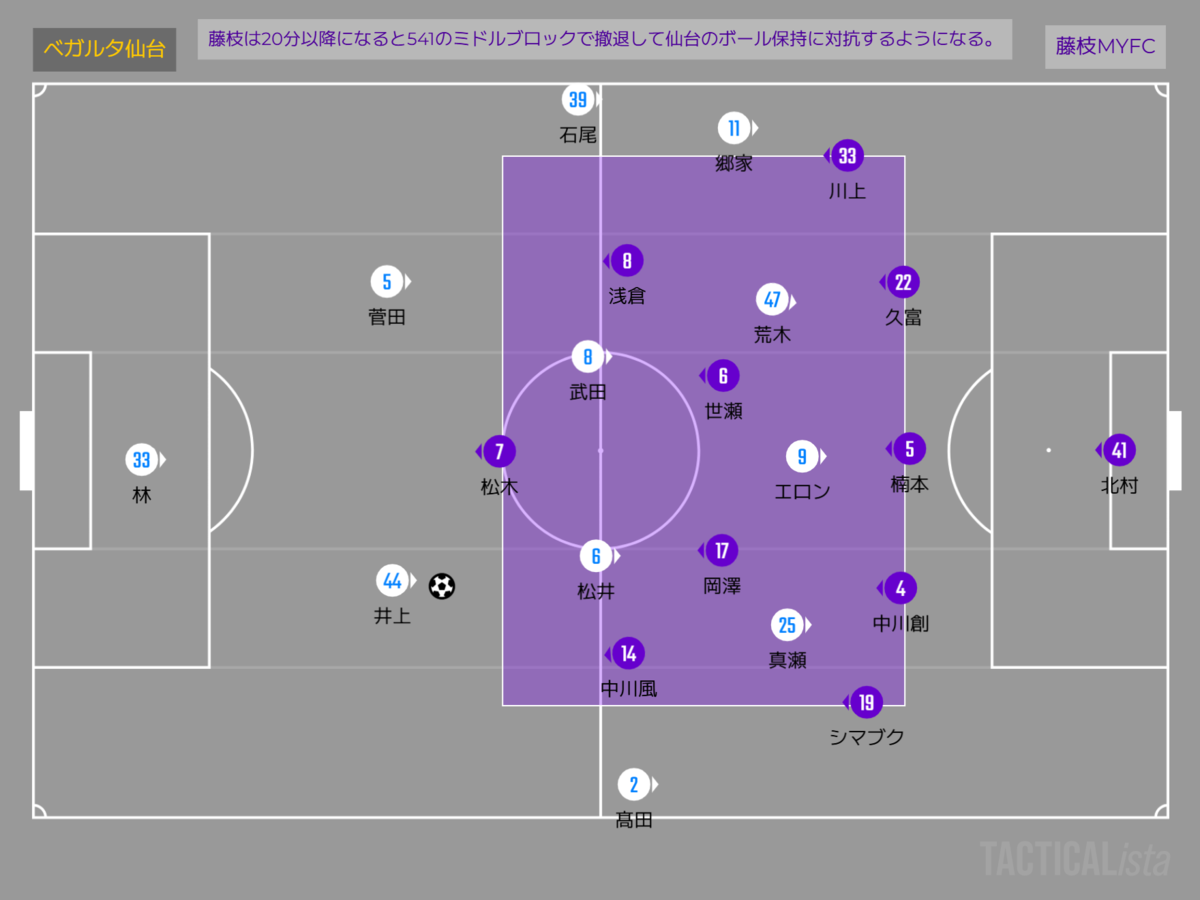 藤枝がミドルブロックへ変わったことで、より高い位置でボールを保持できるようになった仙台だが、そのぶん狙っていた背後のスペースが消えたことで、横パスが増えて攻撃が停滞していく。