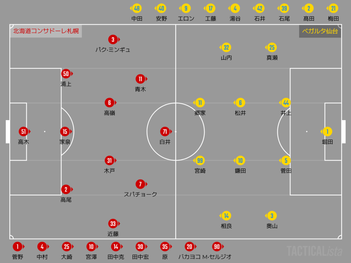 札幌は、今節も荒野が出場停止となっている。スタメンは西野に代わって家泉が3バックの真ん中に起用され、スパチョークが右シャドーとなっている。ベンチには出場停止明けの宮澤、バカヨコ、マリオ・セルジオが復帰している。