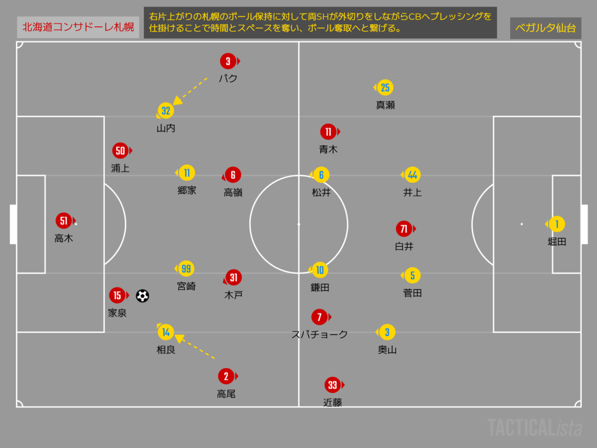 対する仙台は、4-2-4の布陣で2トップが背中でダブルボランチを消しながら、家泉と浦上に対しては相良、山内の両サイドハーフが外切りをしながら睨みを利かせる。