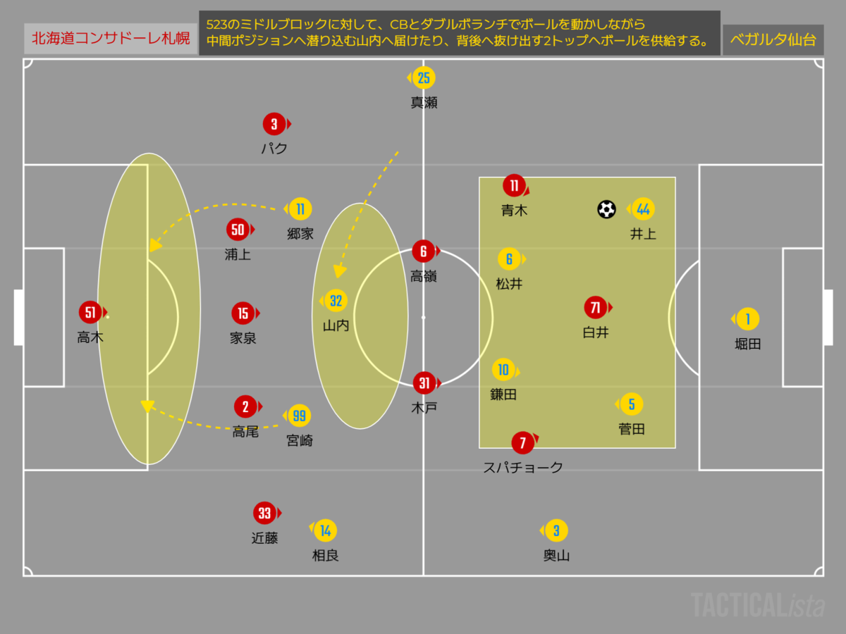 ファジーなポジションを取る山内に対してマンツーマン気味で守る札幌は誰がどこまで付いていくかが曖昧になって、札幌にとって非常に厄介な存在となっていた。
