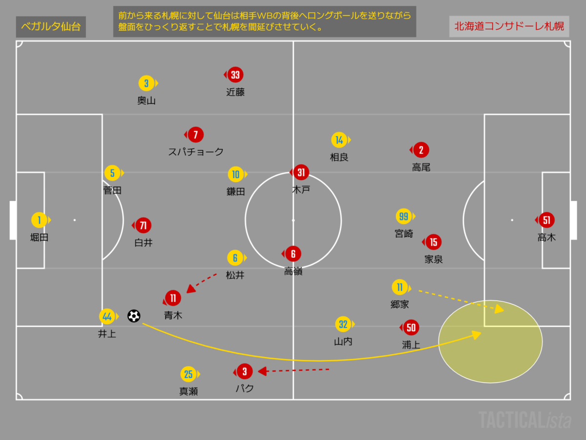 後半は前からボールを奪いに行きたい札幌に対して、仙台は前述のロングボールを活用することで札幌を間延びさせて、中盤でセカンドボールを回収することで敵陣でのプレータイムを増やしていった。